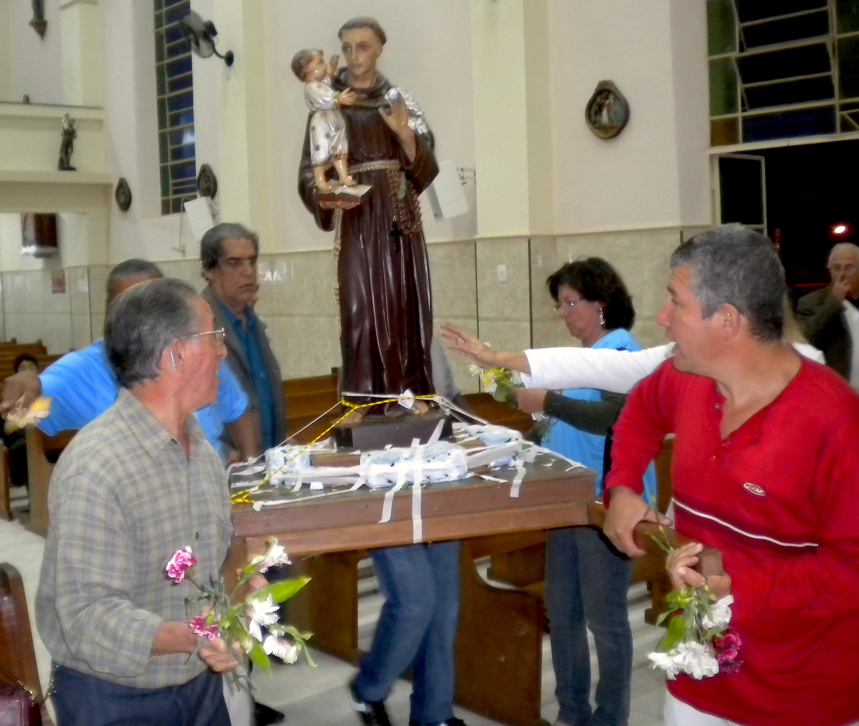Pedro Paulo, the seminarian spending his pastoral year at the parish, asked me if I wanted to participate in the procession. I said “Yes! Of course!” I really did say that, in English, because he wants to practice his English with me (and he needs all the practice he can get). He led me six blocks to St. Anthony church, while it was getting dark (at 6 PM – it’s winter here), where a crowd was gathering. The rosary was being prayed and pastoral assistants were scrambling around, getting everything ready.
