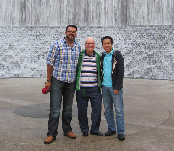 Novice Juan Carlos Castaneda Rojas, Fr. John Czyzynski (novice master) and James Nguyen at the Gerald D. Hines Waterwall Park in Houston