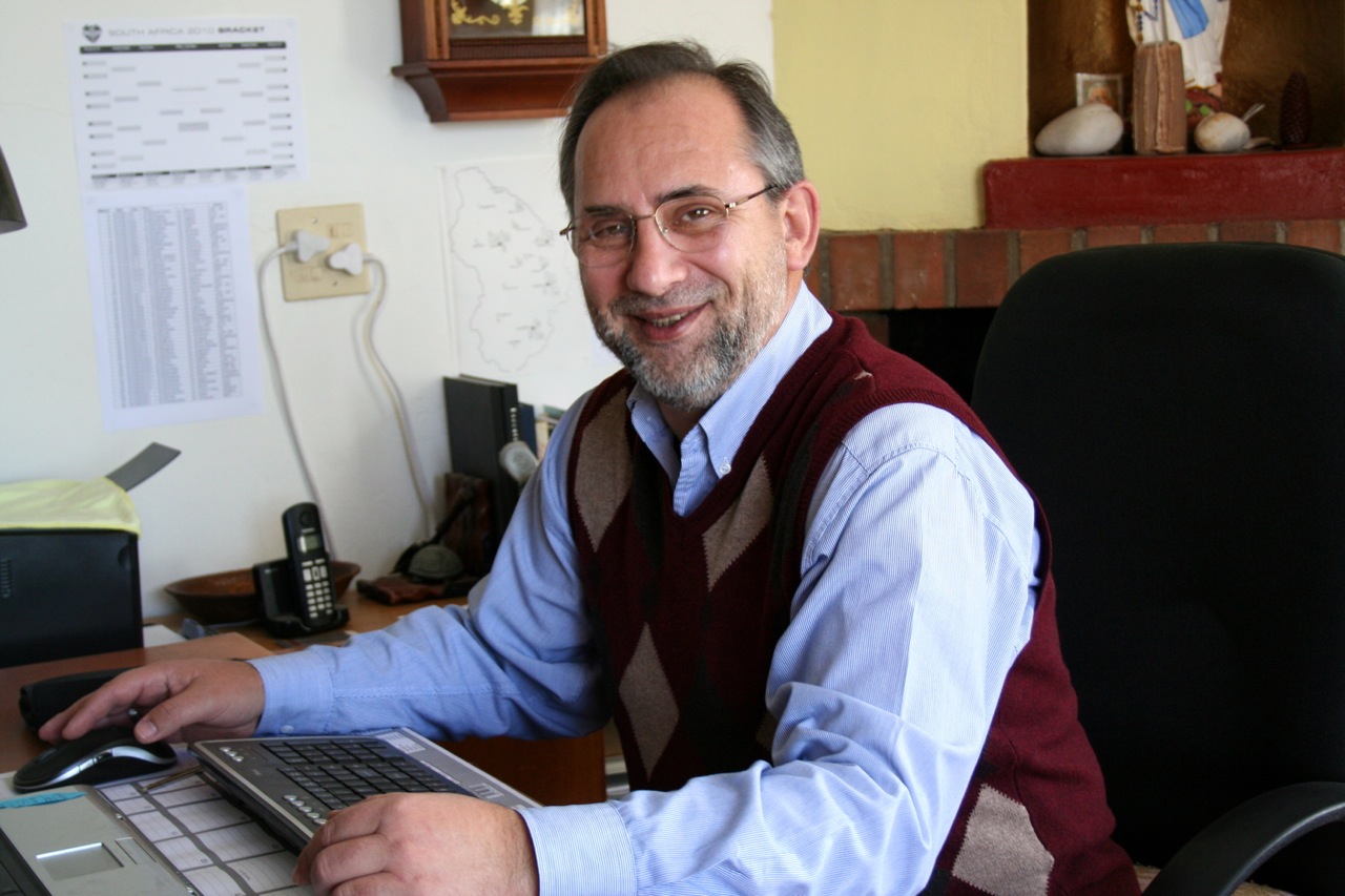 Bishop Adam Musialek at his desk in De Aar. He has been hosting Fr. Tom Cassidy during the former provincial superior’s visit to the Diocese of De Aar.