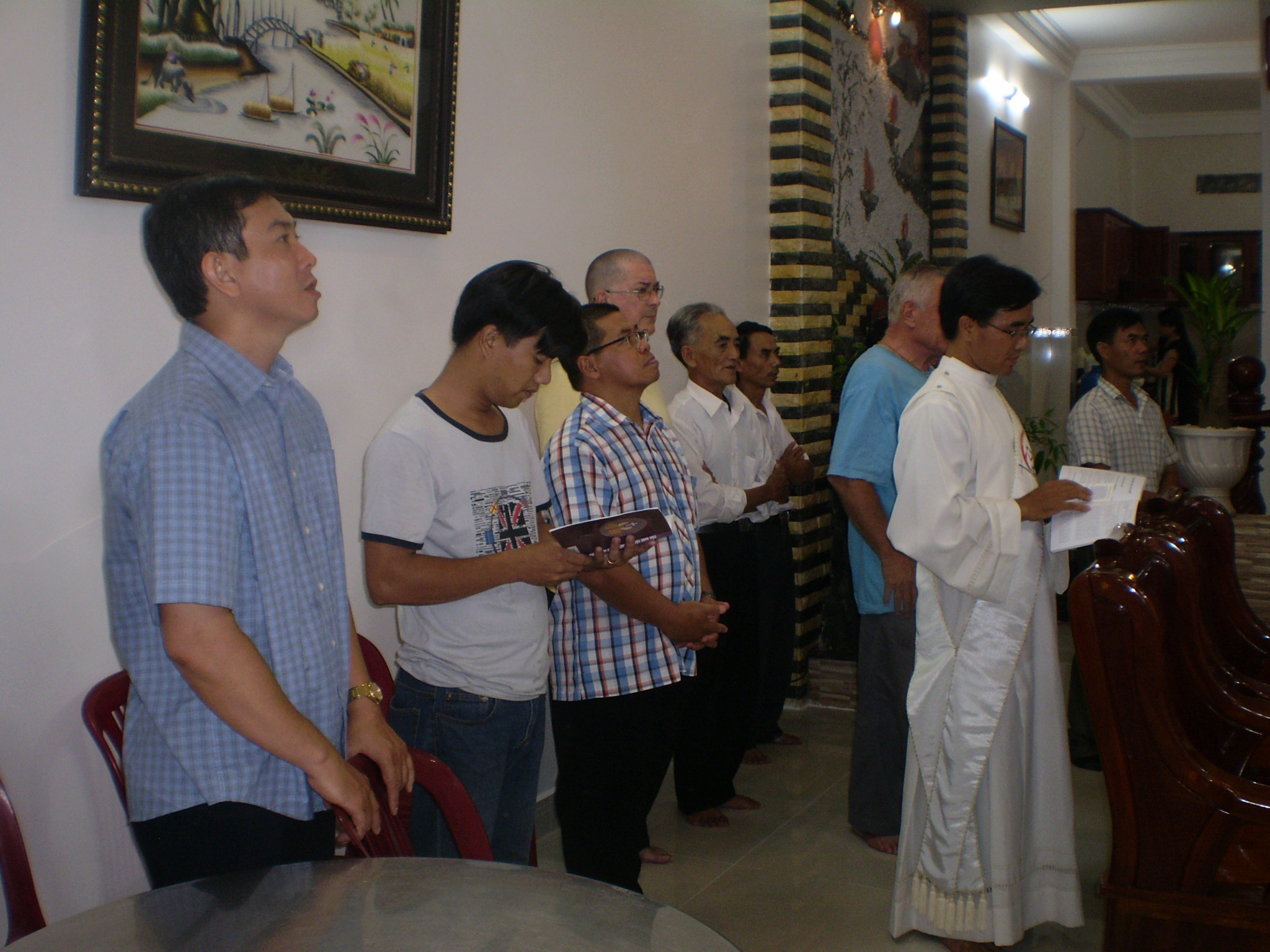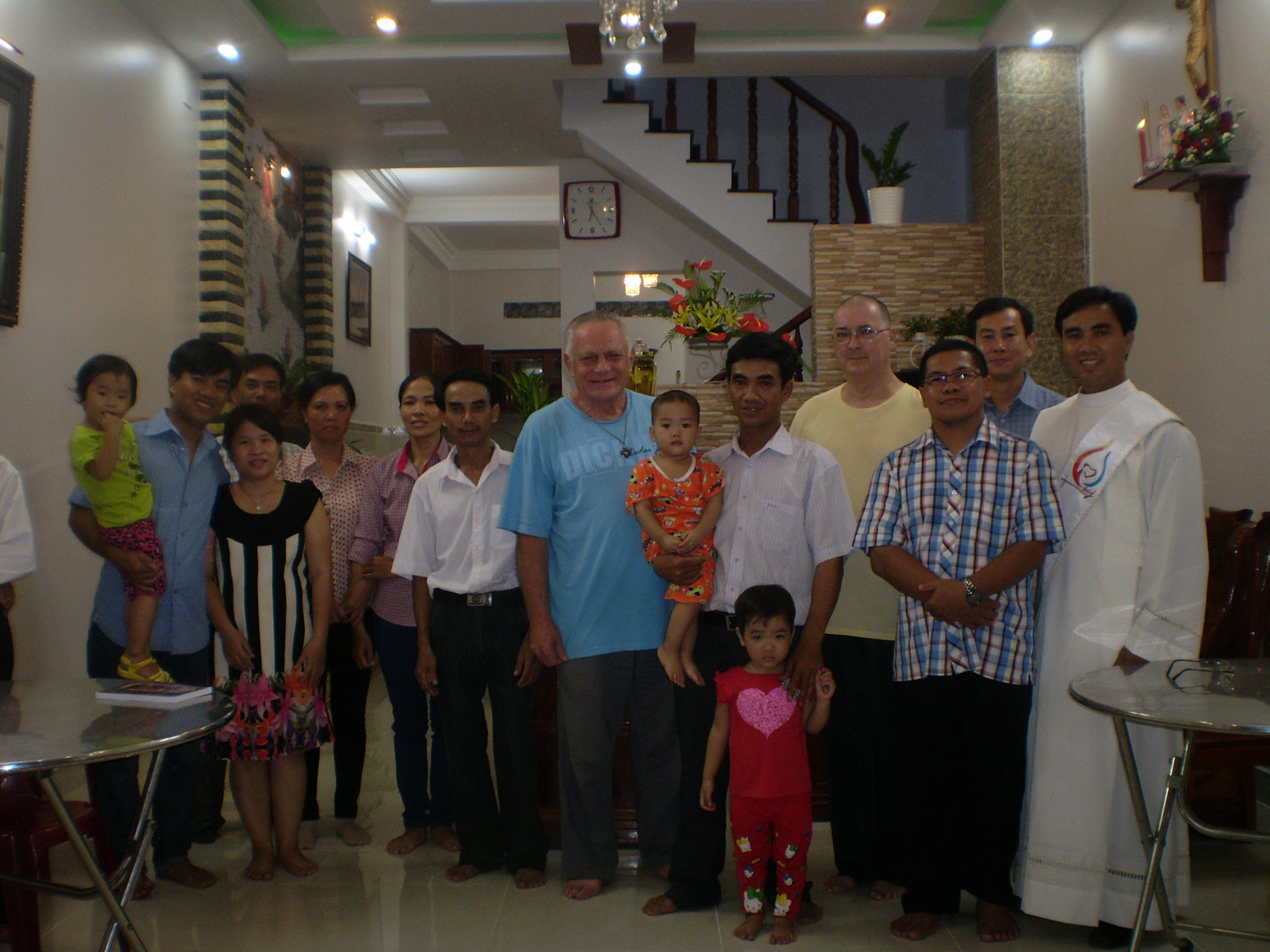 Deacon Phu works in the formation house in Saigon. He also works at St. Paul’s Parish on the weekends. He will be ordained in November. His father, his brother and his sister came to Ho Chi Minh City for the blessing of his younger brother’s home. The community was invited to attend. Before going to his house, we also blessed a neighbor’s home. In both homes, an altar was prepared on a major wall. The wooden altar had a beautiful statue of the holy family. I believe that the statue of the child Jesus had a heart. Their also was a small bouquet of flowers. Above this shrine, there was a large wooden crucifix.
