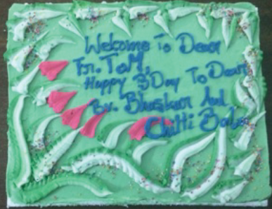 The “welcome” wishes came on Fr. Tom’s last night with the community, but cake is good no matter when it is served!