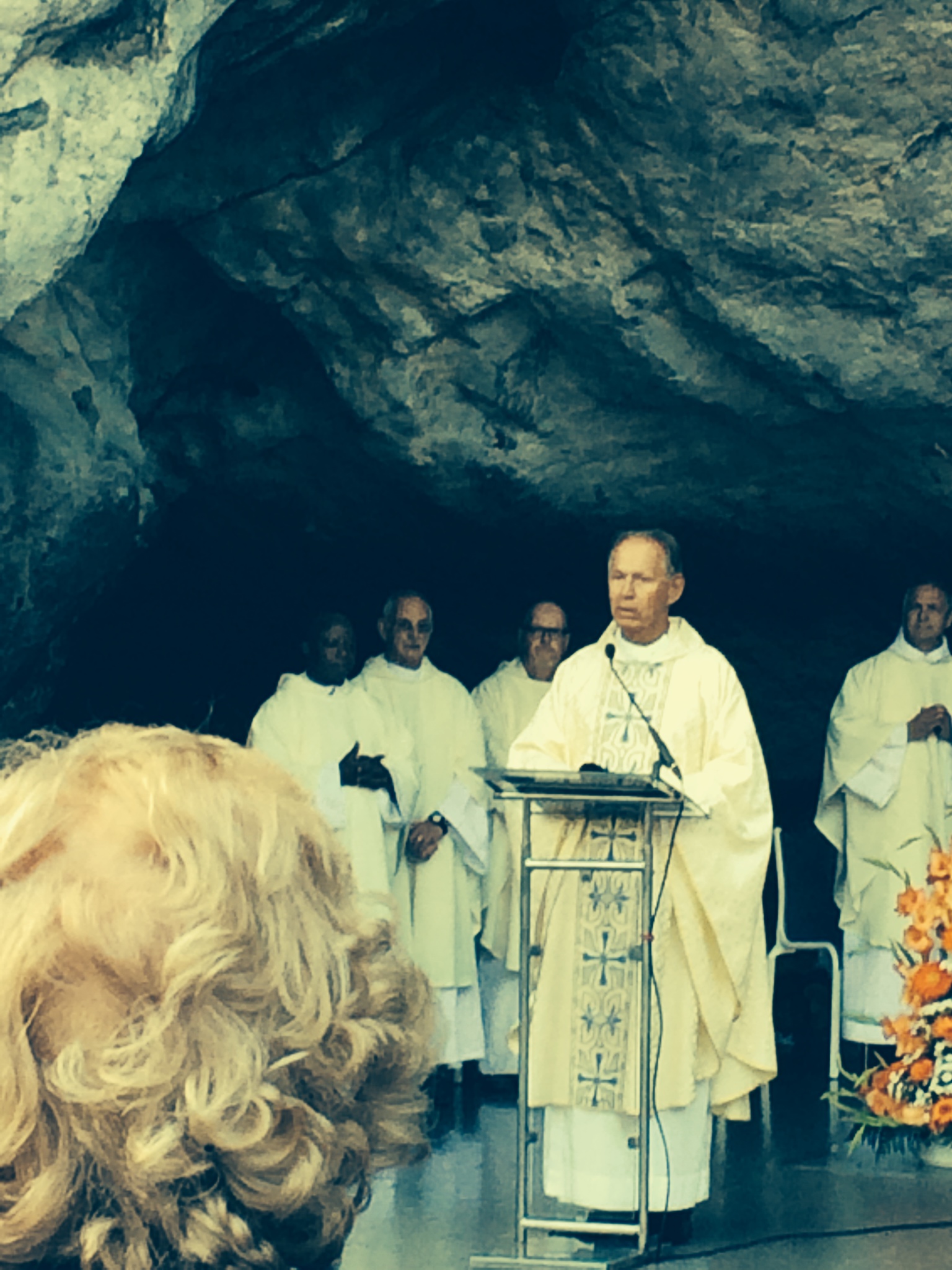 I was chosen by the three others to have the honor of presiding in the Grotto cave. I was going to preach but suggested that Fr. Jerry do so because he is a regular. It was a wonderful experience. Then we did a walking tour, first of a new, massive underground church for pilgrims, then of Bernadette Soubirous’s home in a mill, then of a home her father owned before becoming unemployed because of an accident. The home is still in the family. We walked across town to Sacred Heart Parish where she was baptized. Then seven of us had lunch outside at a cafe, the Leffe, while others went back for the baths at 1:00 p.m.