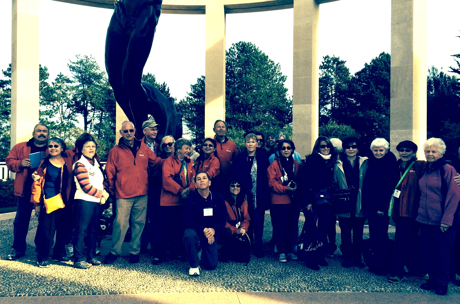 Fr. Dominic presided at Eucharist, and a group of Spanish-speaking people joined us. After, Fr. Dom and I caught a sandwich and drink on the way down. We had a two-hour trip to the Omaha Beach Cemetery and a brief visit. Our French guide reminded us that we were entering American territory. Under a clear blue sky, overlooking the sea, set in lush green grass were thousands of stark white crosses and a few stars of David marking our dead young Americans. It was literally breathtaking. We took a group picture in front of the memorial, and behind it were walls with all the names of the deceased. Then we went to Omaha beach to gather sand, and there stood a touching monument of a young soldier charging through the surf, dragging his dead buddy behind him. Needless to say, we left in a very somber, sober mood. After a time of reflection we prayed for all the deceased and then said Pope Francis’s prayer for peace that there be war never again. We got back late for another wonderful dinner of shrimp with avocado salad, pork leg with potatoes, and dessert.