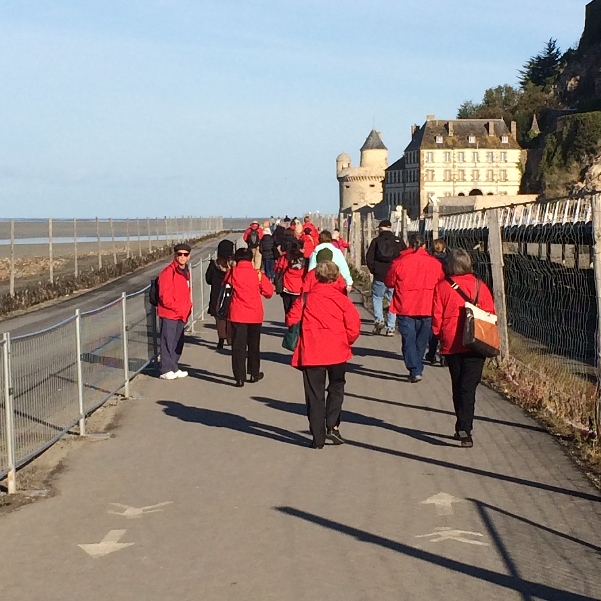 Sunday, October 5: I had a good sleep for the first time and the morning offered a 6:30 a.m. American breakfast with eggs and bacon/sausage. We left for a 92-mile, over two hour, bus ride to Mont St. Michel, which was visible from miles out. It was a beautiful, sunny day. There is new parking far from the island, with shuttles to the new bridge. The former causeway will be removed soon because it blocks the tides and was reconnecting the island to the mainland. It was an incredible climb up the mountain on a very narrow pedestrian street chocked with shops, restaurants, and hotels.